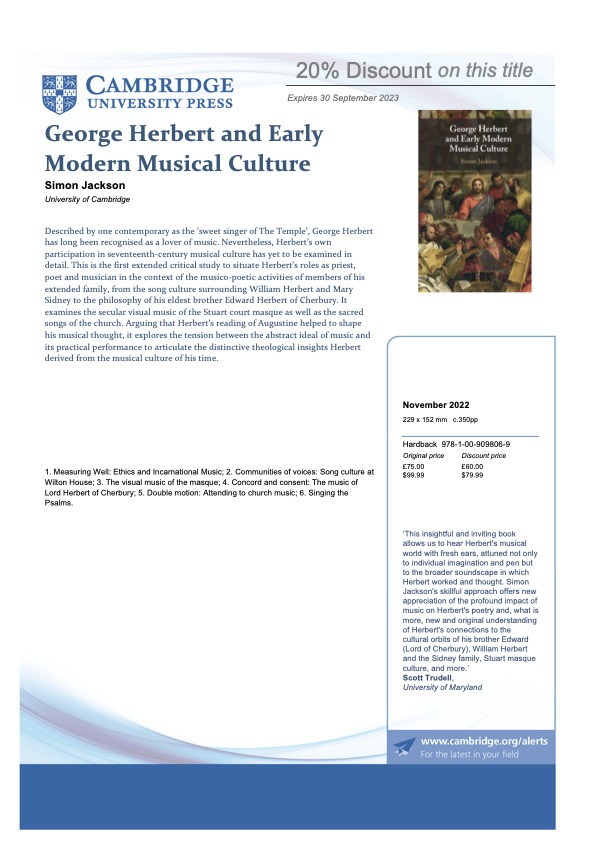 George Herbert and Early Modern Musical Culture is that rarest of things – a triumph of learned, insightful interdisciplinarity. Jackson writes with equal sensitivity on music, verse, and biography, and tunes all three into a beautiful critical consort. His book is a landmark achievement in the study of Herbert and of early seventeenth-century artistic culture – a must for every lover and scholar of Herbert and his circle.”